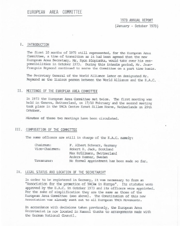 În 1973, a început tranziția de la funcționarea sub egida Alianței Mondiale, cu formarea unui secretariat în Kassel, Germania. Egon Slopianka din Germania a devenit și primul Secretar European. S-a pus mare accent pe sprijinirea instituțiilor europene (Centrul European al Tineretului, Consiliul Europei), YMCA primind sprijin instituțional și de proiect. S-au depus eforturi semnificative în noi inițiative, cum ar fi Interrail, cursurile de limba engleză și seminariile pentru pace.